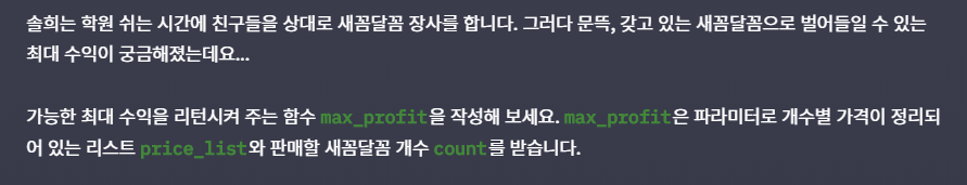 - 그리고 나서 사려는 수가 가격 리스트의 길이보다 큰지 작은지 판단하여 작다면 한명에게 모두 파는 경우를 '일단' cache에 넣어주고 count가 그 값보다 크면 '일단' profit = 0 을 넣어준다.