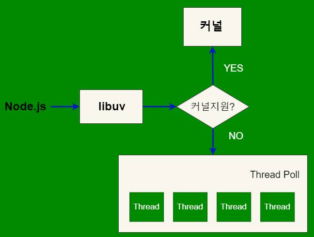 운영체제를 추상화 하였기 때문에 libuv는 Node에서 처리하고자 하는 비동기 작업이 운영체제에서 지원을 하는 것인지, 지원하는 것이 아닌지 판단이 가능하다.